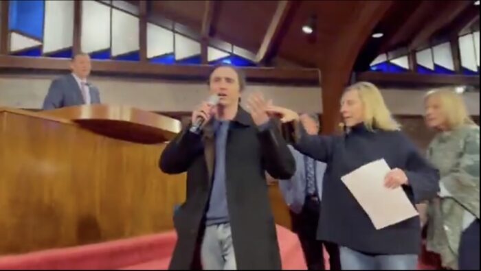Une vidéo montre Suozzi en train de s’exprimer mercredi soir lorsque des militants de Climate Defiance ont fait irruption dans la synagogue avec des couches et des genouillères, proférant des insultes et des commentaires ignobles.