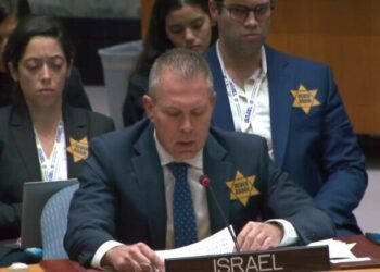L'ambassadeur d'Israël à l'ONU, Gilad Erdan, s'adressant à la réunion du Conseil de sécurité de l'ONU sur la guerre entre...