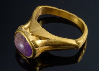 Une cave et une spectaculaire bague ancienne en or avec incrustation de pierres semi-précieuses déterrée lors de fouilles. Lors d'une...