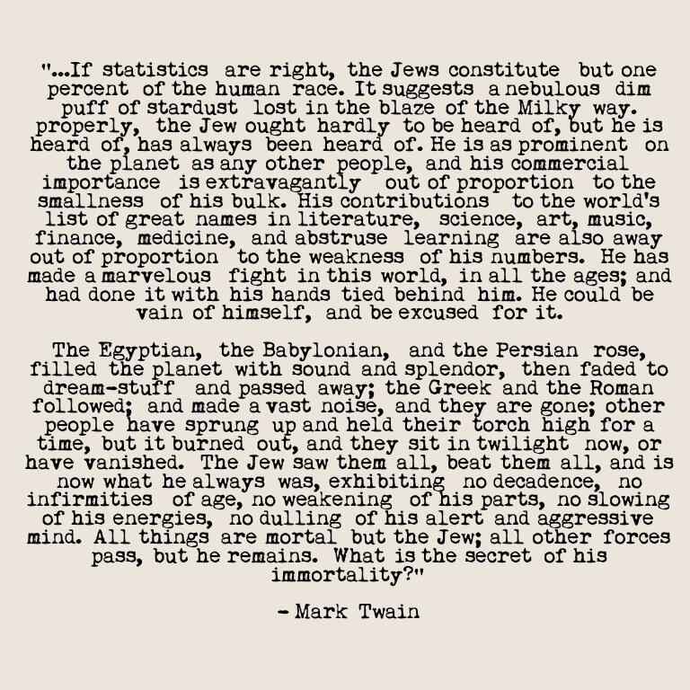 Il est aussi important sur la planète que n’importe quel autre peuple, et son importance économique est d’une extravagante proportion comparée à la petitesse de sa taille. Ses contributions à la liste du monde des grands noms de la littérature, de la science, des arts, de la musique, de la finance, de la médecine et des apprentissages complexes sont également de loin hors de proportion avec la faiblesse de son nombre. Il a fait dans ce monde un combat merveilleux, à toutes les époques ; et il l’a fait avec les mains attachées derrière le dos.