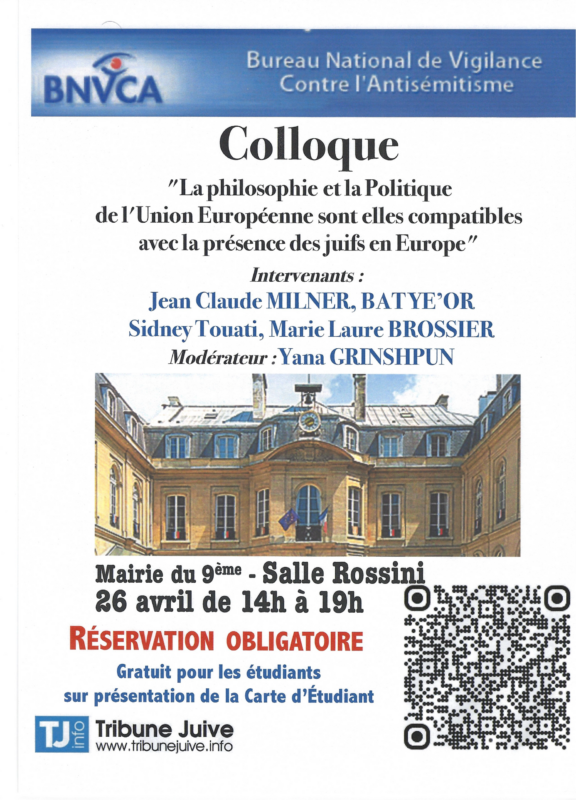 Colloque du BNVCA avec J.C. Milner, Bat Ye’Or, Sydney Touati, M.L. Brossier 26 avril – Avec Tribune juive