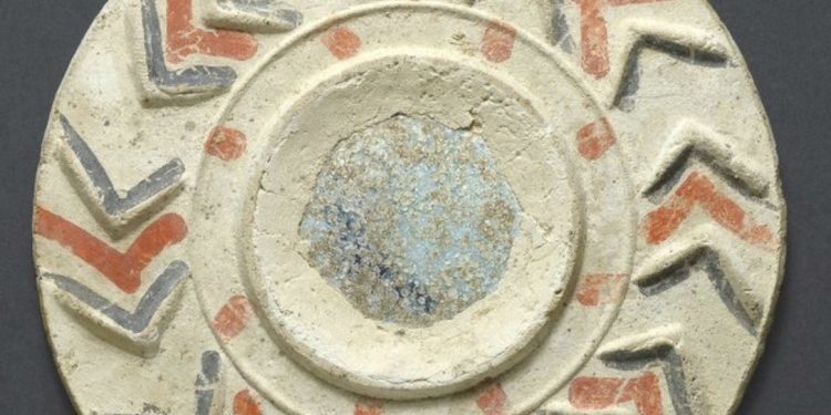 « le fragment fait partie d’un « miroir magique » de la période byzantine, du IVe au VIe siècle de notre ère. Un miroir de verre, destiné à protéger du mauvais œil, était placé au milieu de la plaque : l’idée était que le mauvais esprit, tel qu’un démon, qui regardait dans le miroir, verrait son propre reflet, ce qui protégerait le propriétaire du miroir. Des plaques de miroir similaires ont été retrouvées dans le passé comme cadeaux funéraires dans les tombes, afin de protéger les défunts dans leur voyage vers le monde à venir ».