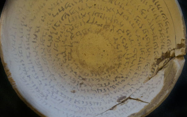 Les bols à incantation, connus sous le nom de « bols à juron », étaient utilisés comme une sorte d’amulette dans l’Antiquité et remontent aux 8e-4e siècles de notre ère. Il était courant de les enterrer sous le sol de la maison pour se protéger. À l’intérieur des bols, des inscriptions magiques étaient écrites dans la langue babylonienne et araméenne. L’inscription dans le bol est censée combattre les malédictions, les démons, les maladies et les parasites.