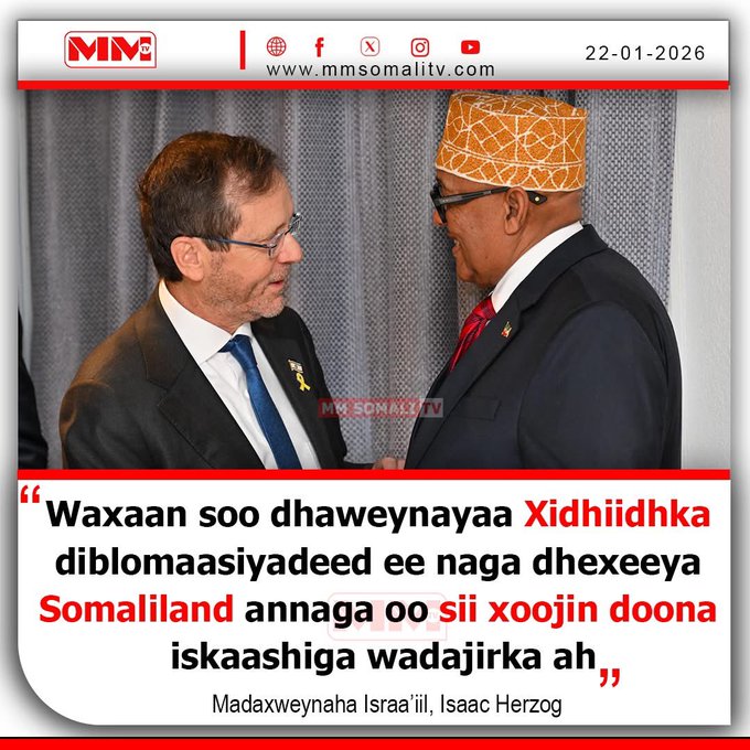 « J’ai été ravi de rencontrer ici à Davos le président du Somaliland @Abdirahmanirro. Je me réjouis de l’établissement de relations diplomatiques entre nos deux nations et j’ai hâte d’approfondir notre coopération bilatérale dans l’intérêt de nos deux peuples, » a déclaré le Président Isaac Herzog.