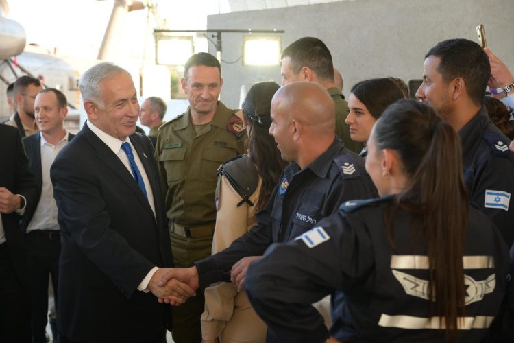 Le Premier ministre Benjamin Netanyahou, le ministre de la Défense Yoav Gallant, le chef d'état-major des FDI et général de corps d'armée Herzi Halevi, et le commandant de l'armée de l'air et général de division Tomer Bar. Pessah avec les soldats de la base aérienne de Tel Nof.