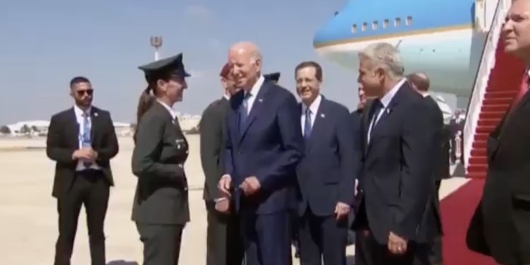 Joe Biden est descendu de l’avion, il est entouré du Premier ministre Lapid, du président Herzog, des services de sécurité, et une jeune soldate à la longue queue de cheval l’accueille.