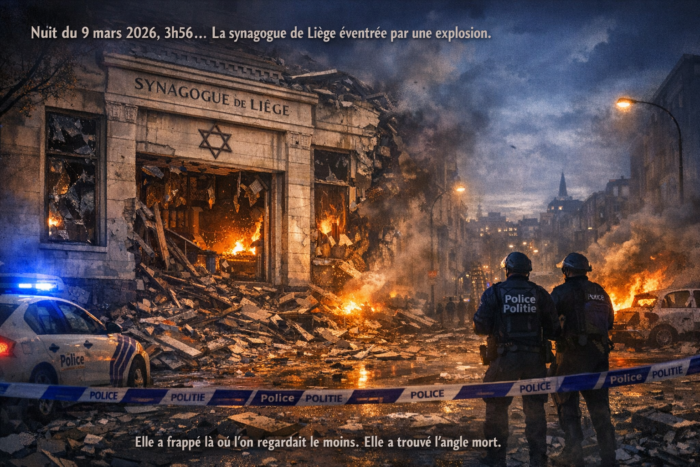 Dans la nuit du 8 au 9 mars 2026, peu avant quatre heures du matin, une explosion a soufflé les fenêtres de la synagogue de Liège. Pas à Anvers, où la densité de la vie juive et l’épaisseur du dispositif sécuritaire rendent la menace à la fois plus visible et plus anticipée. Pas à Bruxelles, durablement placée sous vigilance depuis les attentats de 2014 et 2016. Mais à Liège : ville ouvrière, laïque, attachée à son imaginaire civique, et peut-être pour cela même moins disposée à penser sa propre vulnérabilité. La bombe n’a pas frappé n’importe où. Elle a frappé là où l’on regardait le moins. Elle a trouvé l’angle mort.