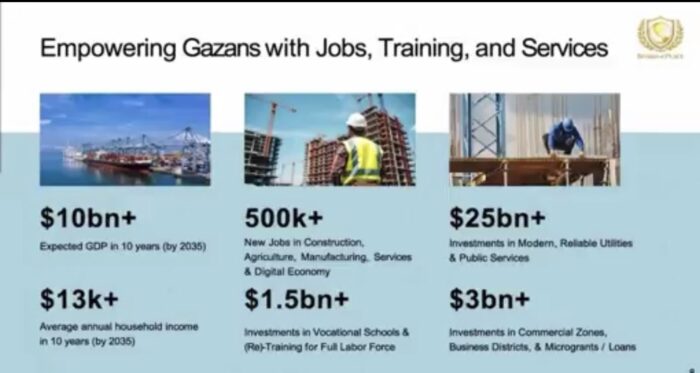 La présentation s’articule autour d’une stratégie d’investissement de 112 milliards de dollars dont l’objectif principal est de monétiser 70 % du littoral de Gaza en 10 ans.