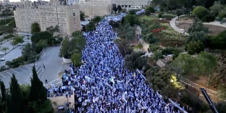 Un rassemblement immense. Des centaines de milliers de manifestants se sont rendus à Jérusalem pour la « Marche du million », devant la Knesset jeudi soir – pour « soutenir les réformes judiciaires prévues par le gouvernement » selon le message officiel, mais selon moi, non pas pour soutenir, mais pour s’opposer à toute tentative du gouvernement de céder aux pressions de la gauche et de l’opposition, qui ne veulent pas de cette réforme qui leur retirerait leur pouvoir extra-démocratique.