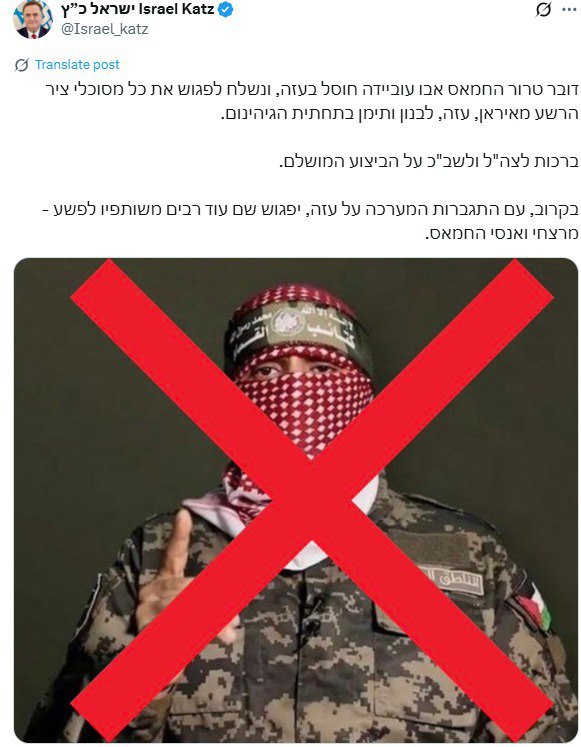 • Menaces médiatisées (octobre 2023) : dans une déclaration vidéo diffusée quelques jours après le massacre du 7 octobre, Abu Obaida avait menacé de tuer un otage israélien pour chaque bombardement non annoncé par Israël. Ces annonces, accompagnées de vidéos montées et sous-titrées en plusieurs langues, avaient un double objectif : terroriser la société israélienne et maintenir la pression sur les chancelleries occidentales.