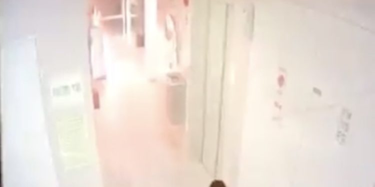 Des documents provenant des caméras de sécurité installées dans l’immeuble montrent le criminel entrant et sortant de l’ascenseur, où il a apparemment préparé un cocktail Molotov. Il a ensuite jeté le cocktail Molotov dans le hall et a quitté les lieux :