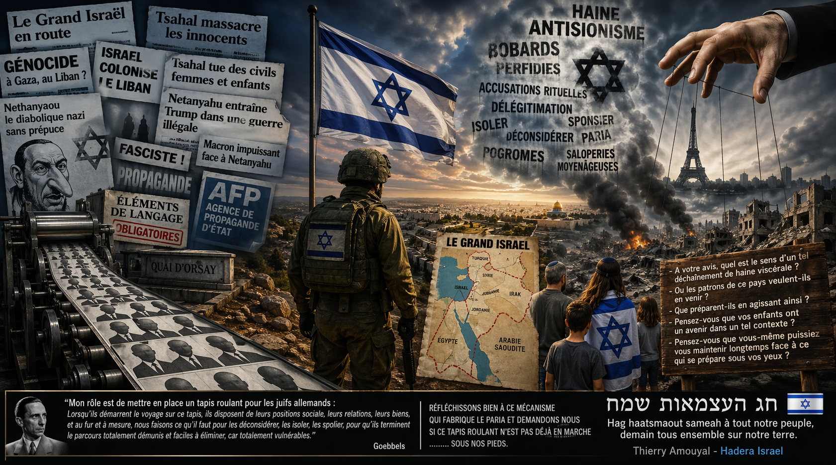 Je suis d’ailleurs parfaitement accoutumé, depuis des années, à ne voir défiler qu’une écrasante majorité d’articles défavorables à Israël et au peuple juif, et j’avoue franchement que le tropisme antisioniste de la presse française me laisse plutôt stoïque et philosophe ; du reste mes années d’expérience me sont alors précieuses pour filtrer le flux des bobards et autres perfidies et il m’arrive même d’esquisser un sourire lorsque la ficelle devient très épaisse.