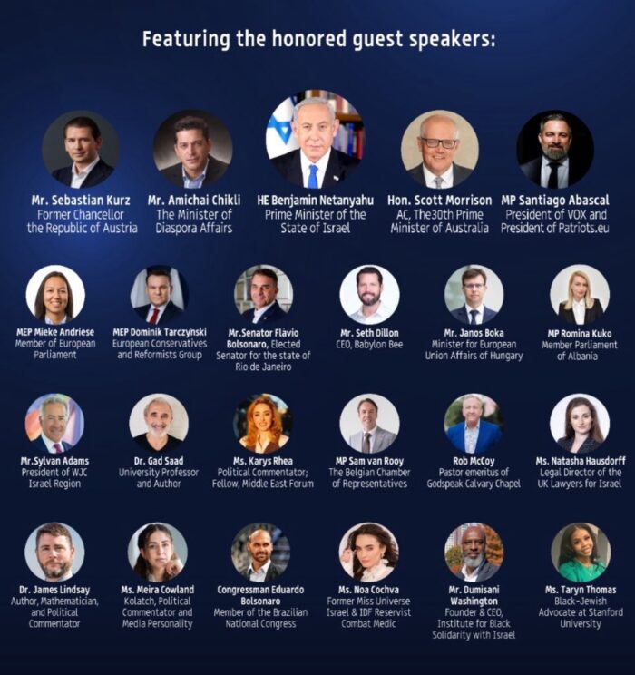 La coférence réunissait le ministre israélien des affaires de la diaspora et de la lutte contre l’antisémitisme Amichai Chikli, ainsi que des dizaines d’invités venus du monde entier, dont Leo Terrell, envoyé spécial de l’administration Trump pour la lutte contre l’antisémitisme sur les campus universitaires ; Rob McCoy, pasteur de Charlie Kirk, qui a accepté un prix d’honneur à la mémoire de Kirk ; le Premier ministre albanais Edi Rama ; l’ancien chancelier autrichien Sebastian Kurz ; l’ancien Premier ministre australien Scott Morrison ; le sénateur brésilien et candidat présidentiel Flávio Bolsonaro ; et le ministre argentin de la Justice Mariano Cúneo Libarona.