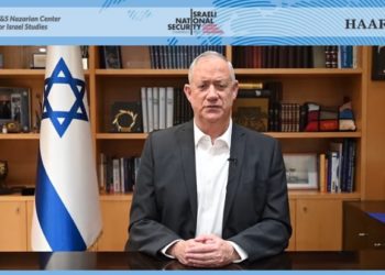 Le ministre de la Défense, Benny Gantz, s'exprimant à l'ouverture de la réunion de faction de son parti Bleu et ...