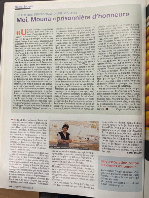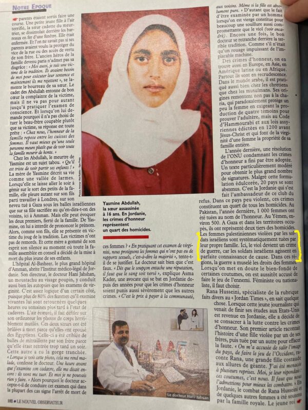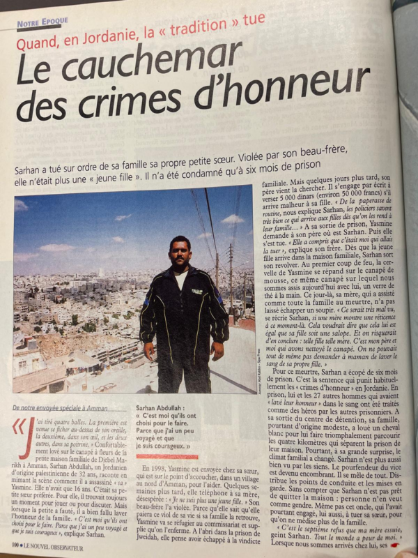 Sur la photo on voit un article concernent un crime d’honneur en Jordanie.