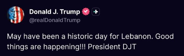 06:00 Trump : « Il se pourrait que ce soit un jour historique pour le Liban. De bonnes choses se produisent ! »