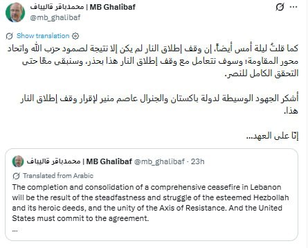 Comme je l’ai dit hier soir, le cessez-le-feu n’était que le résultat de la position ferme du Hezbollah et de l’unité de l’axe de la résistance. Nous traiterons ce cessez-le-feu avec prudence et resterons unis jusqu’à la réalisation de la victoire complète. Je remercie les efforts de médiation du Pakistan. Nous restons fidèles à notre engagement. [Quel est cet engagement ? Eradiquer Israël]
