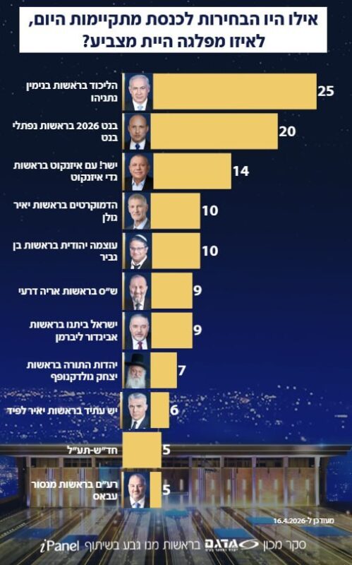 Hier 22:58 Selon les données du sondage de la chaîne de gauche Channel 12, le Likoud de Benjamin Netanyahou se renforce de deux mandats par rapport au sondage précédent, obtenant cette fois 25 mandats. Bennett 2026, le parti de Naftali Bennett, s’affaiblit à 20 mandats (deux de moins que dans le sondage précédent), le parti Yashar de Gadi Eizenkot est le troisième parti, renforçant sa taille à 14 mandats, un mandat de plus que dans le dernier sondage. Lapid et Yesh Atid ne passe pas, ou à tout juste assez pour entrer à la Knesset.
