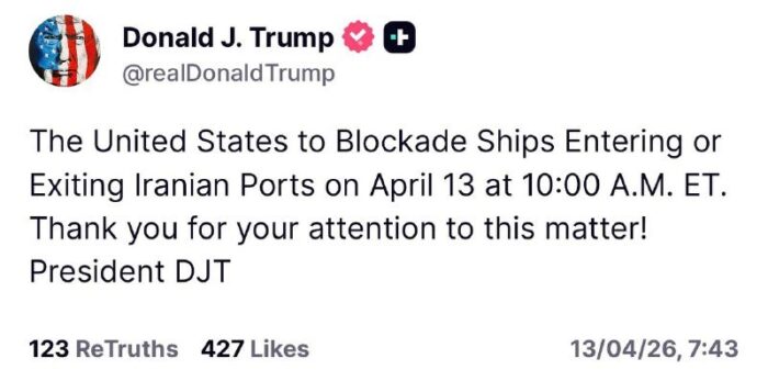 • 07:48 Trump avertit qu’à partir de 17h00, heure d’Israël, « les États-Unis bloqueront les navires entrant ou sortant des ports iraniens »