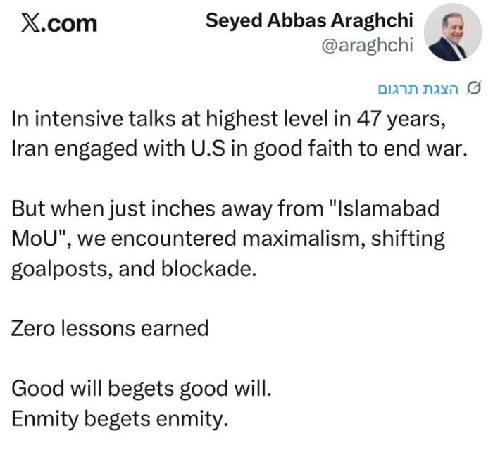 • 00:42 Le ministre iranien des Affaires étrangères s’en prend aux États-Unis : « Nous avons communiqué de bonne foi [c’est exact : l’Iran a dit non à absolument toutes les demandes des Etats-Unis, il a fait les mêmes demandes, sans le moindre changement, que depuis le début des négociations il y a plusieurs mois, mais il l’a fait en toute bonne foi] – et nous avons été confrontés à un siège. »