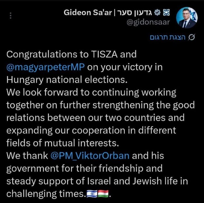 • 01:15 Sa’ar a félicité le chef de l’opposition hongroise pour sa victoire électorale.
