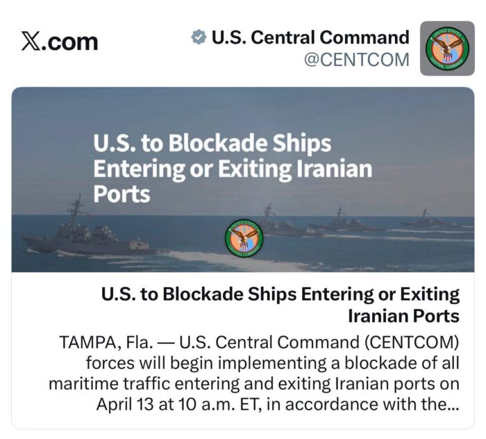 • Hier 23:58 Le CENTCOM se prépare à imposer un blocus naval à l’Iran à partir de demain.