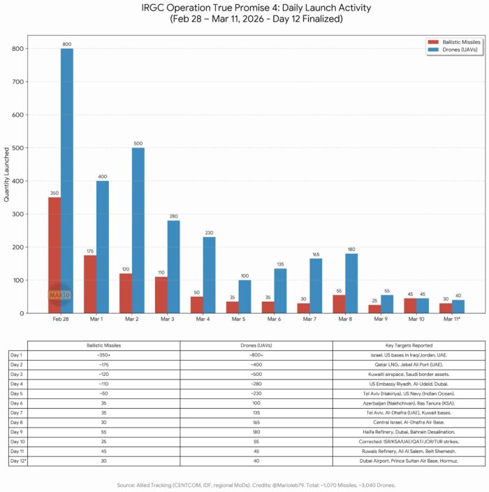 Evolution du nombre de tirs de missiles (rouge) et de drones (bleu) par l’Iran, depuis le début de la guerre, d’après un site d’OSINT (Open Source Intelligence) qui se base sur les sources officielles.