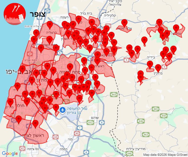 • 01:32 Alarmes déclenchées dans le centre, le bloc Dan, les basses terres et le Sharon suite à un bombardement en provenance d’Iran