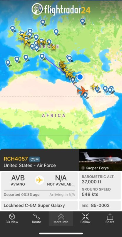 Un énorme avion de transport C-5M se dirige vers l’Arabie saoudite ou le Qatar