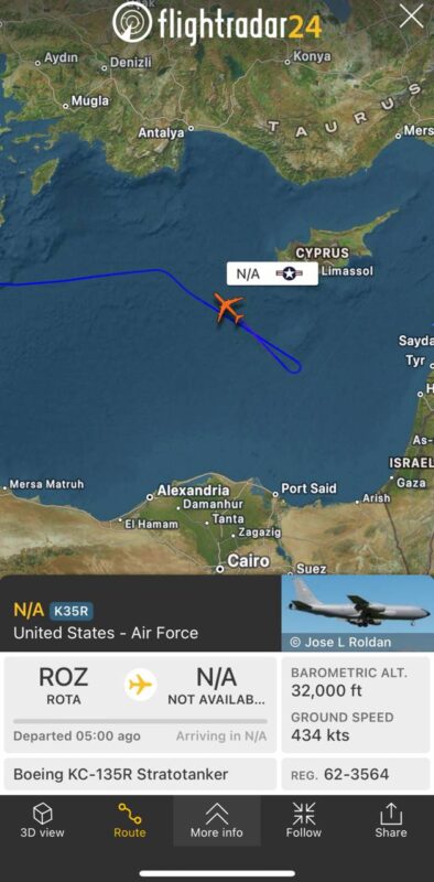 - 00:22 Un avion de ravitaillement en carburant américain de type Boeing KC-135R Stratotanker a été repéré au large des côtes israéliennes