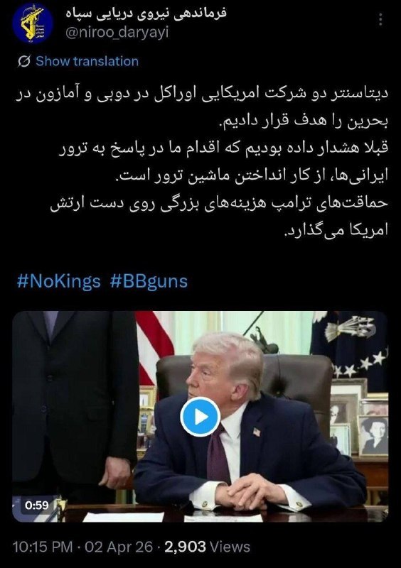 « Nous avons attaqué les centres de données de deux entreprises américaines, Oracle à Dubaï et Amazon à Bahreïn. Nous avons déjà averti que notre action, en réponse à l’élimination d’Iraniens, est la paralysie de la machine terroriste. La stupidité de Trump impose des coûts lourds à l’armée américaine »