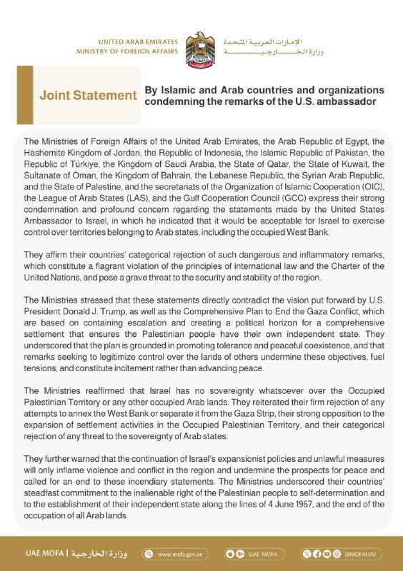 Des pays arabes et musulmans, dont l’Égypte, la Jordanie, la Turquie, l’Arabie saoudite et le Qatar, ont condamné dans une déclaration commune les propos de l’ambassadeur américain en Israël, Mike Huckabee, dans une interview à Tucker Carlson, « dans lesquels il a déclaré qu’il acceptait la domination d’Israël sur des territoires appartenant à des pays arabes, dont la Rive Ouest occupée ».