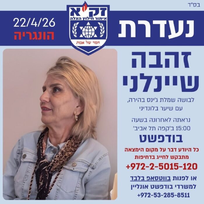 • 23:41 ZAKA a établi un poste de commandement de recherche à Budapest suite à un signalement d’une Israélienne disparue dans la ville, Zehava Sheinlani – qui est sortie vers 15h00 de la zone « Café Tel Aviv » à Budapest, et depuis, le contact avec elle est coupé.