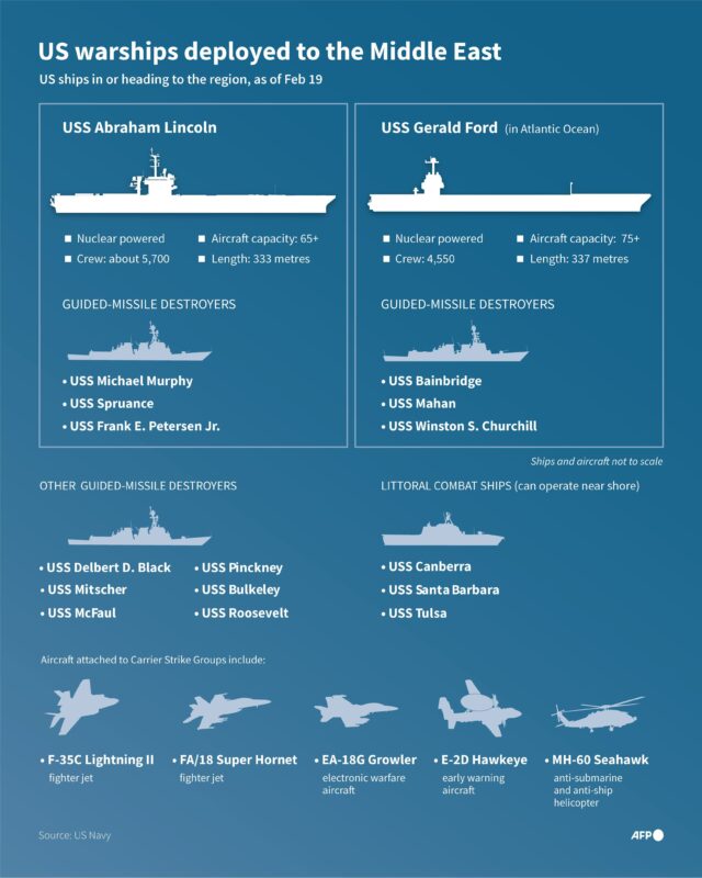 Infographie AFP des porte-avions américains USS Abraham Lincoln et USS Gerald Ford, ainsi que d’autres navires de guerre qui ont été déployés au Moyen-Orient, selon l’armée américaine.