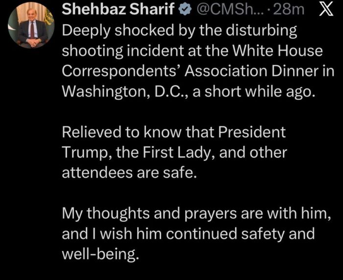 05:59 Le Premier ministre pakistanais Shehbaz Sharif a réagi à la fusillade survenue ce soir lors du dîner des correspondants de la Maison Blanche, se disant « soulagé d’apprendre que le président Trump, la Première dame et les autres invités sont sains et saufs ».