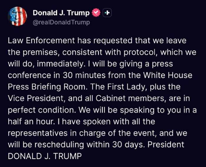 U.S. President Donald J. Trump has said that it’s unlikely tonight’s shooting at the White House Correspondents Dinner had anything to do with the war against Iran. pic.twitter.com/oSzmhaM2ry