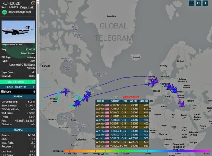 08:28 Beaucoup d’avions lourds de l’armée de l’air américaine de type C-17A – C-5M sont en route vers le Moyen-Orient.