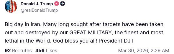 05:41 Trump : « Journée importante en Iran – notre formidable armée, la meilleure et la plus puissante au monde, a détruit des cibles que nous avions en ligne de mire depuis longtemps. Que Dieu vous bénisse tous !»