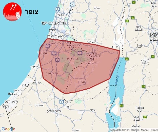 Hier 22:23 Le bombardement en direction de la région de Jérusalem a été intercepté ; il est possible de quitter les zones protégées.