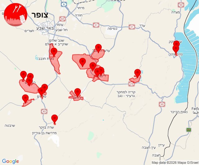 Hier 23:13 Des alarmes également à Beer Sheva, sans aucun avertissement préalable.