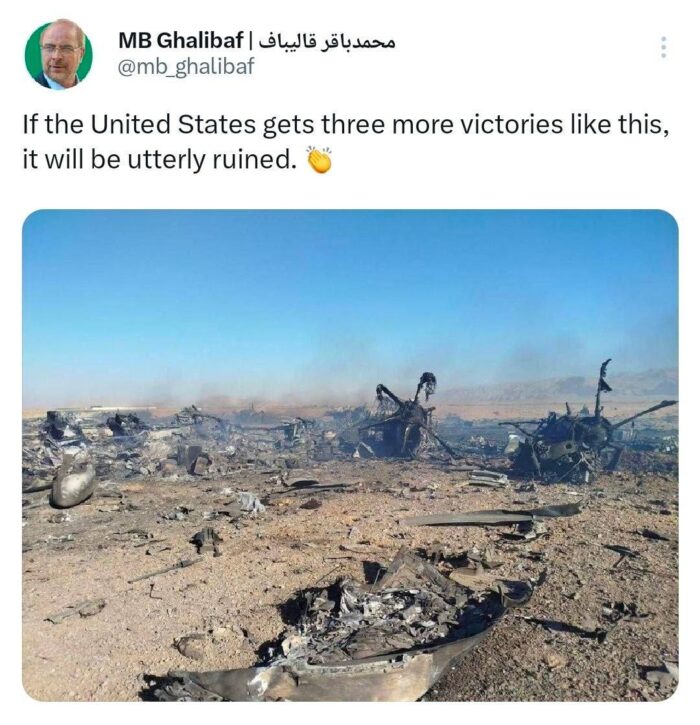 08:52 Le président du parlement iranien, Kalibaf, publie une photo attribuée aux avions américains et écrit : encore 3 victoires comme celle-ci et les Américains seront éliminés.