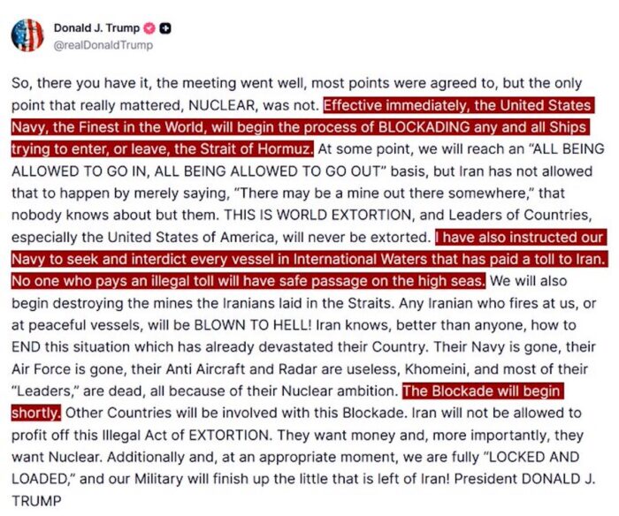 Et boum, Trump vient d’ordonner à la marine américaine de bloquer le détroit d’Ormuz à « tous les navires qui tenteraient d’y entrer ou d’en sortir ». Il a également ordonné à la marine américaine de rechercher et d’intercepter tout navire se trouvant dans les eaux internationales qui aurait versé un péage à l’Iran, et ce afin de créer une situation de blocage qui empêche l’Iran de s’enrichir illégalement avec le détroit :