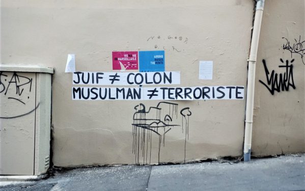 Nous avons collé cette phrase à plusieurs reprise dans la ville de Marseille. Luttons contre les amalgames ! Luttons contre l’antisémitisme ! Solidarité avec les Musulman-e-s qui subissent l’islamophobie !