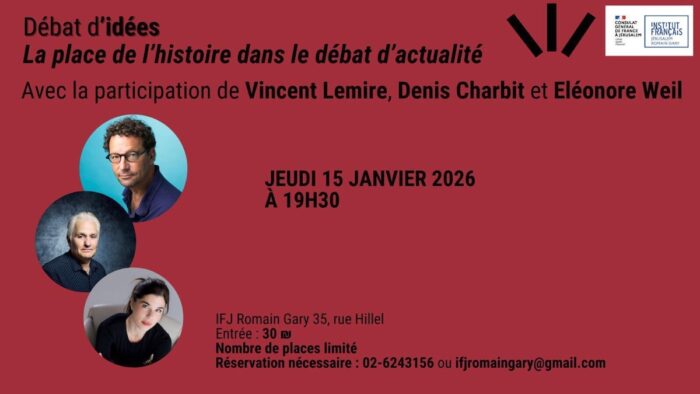 L’Institut Français Romain Gary à Jérusalem organise jeudi 15 janvier 2026 un débat avec Denis Charbit et Vincent Lemire. L’animatrice sera Eléonore Weil, correspondante de Libération. Or, Lemire est interdit d’entrée en Israël.